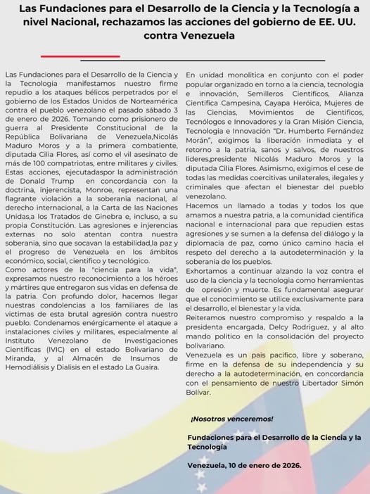Las Fundaciones para el Desarrollo de la Ciencia y la Tecnología expresamos nuestra más enérgica condena ante las acciones de agresión militar ejecutadas por la administración estadounidense.